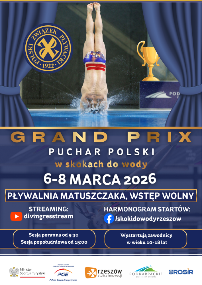 Zapraszamy na pierwszą w tym roku edycję zawodów Grand Prix – Puchar Polski w skokach do wody, które odbędą się w dniach 6–8 marca 2026 r. w Rzeszowie!