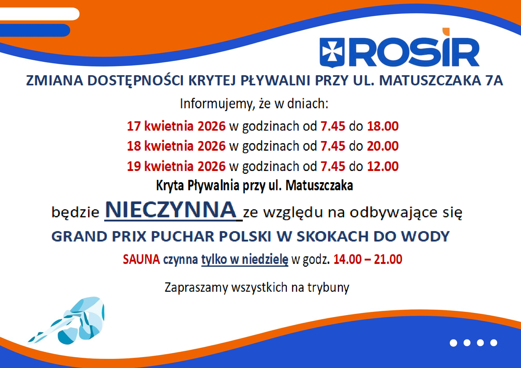 ZMIANA DOSTĘPNOŚCI KRYTEJ PŁYWALNI PRZY UL. MATUSZCZAKA W DNIACH 17-19.04.2026 R.